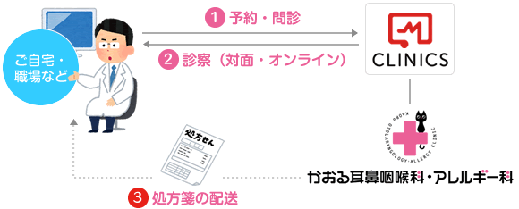 はじめての方は、今まで通り、実際に当医院まできていだだき、診察を受けていただきます。通院している中で、なかなか通院の時間が、とりにくくなってきた、アレルギーの時期は混んでいるので、少しでも、待ち時間を減らすことはできないものか?大荒れの大雨の日に、お薬が切れたら困る。などなど、自分の病気よりも、通院しなければならないことが苦痛になってきてしまう、そんな悩みを、一緒に解決していきませんか?